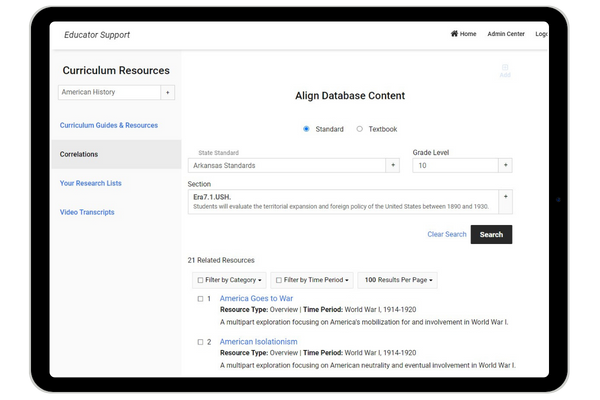 The Educator Support Site, part of every ABC-CLIO school database, allows educators to match database resources to specific standards, searchable by state, grade level, and specific learning standard.